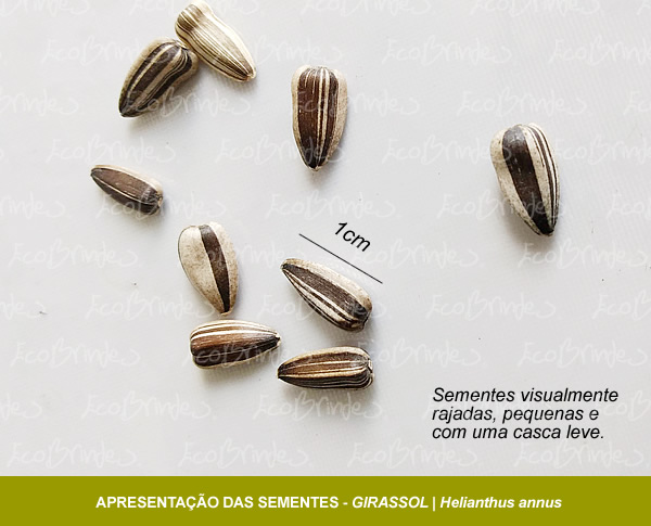 As sementes do Girassol no geral tem a mesma aparência, visualmente rajadas, com uma casca leve, sem dormência tegumentar e de fácil germinação. Possuem um formato tipo “cabaça” e medem entre 1cm e 1,5cm.