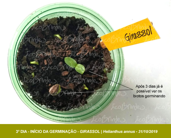 O tempo de germinação pode variar de semente para semente por inúmeros fatores, mas aqui em nosso experimento ela ocorreu em 3 dias corridos. No geral as sementes de Girassol são bem fáceis de germinar. Abaixo de cada foto você notará a data em que ela foi tirada e assim você acompanha a cronologia de todo o processo. As sementes deste experimento foram depositadas em 28 de Outubro de 2019
