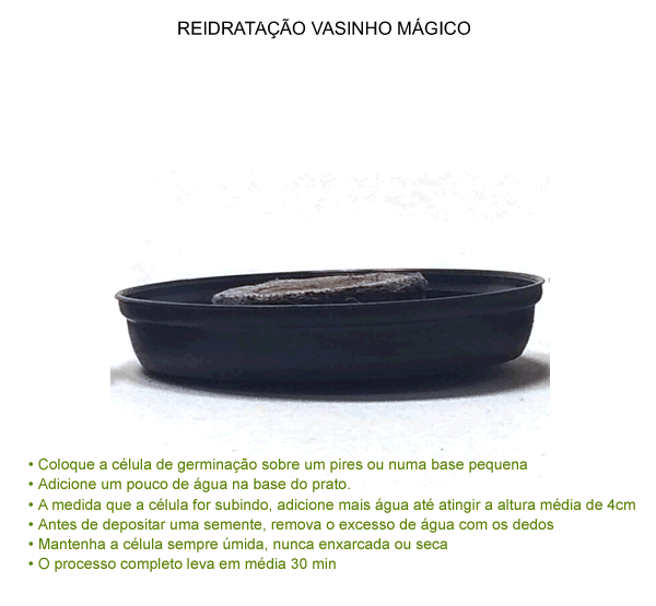 Se você recebeu algum kit contendo o Vasinho Mágico (Célula Germinativa), confira abaixo as instruções para reidratá-la. O depósito das sementes segue a mesma regra do substrato comum, entretanto semeie de 1 a 2 sementes por vez, pois sua superfície é menor.