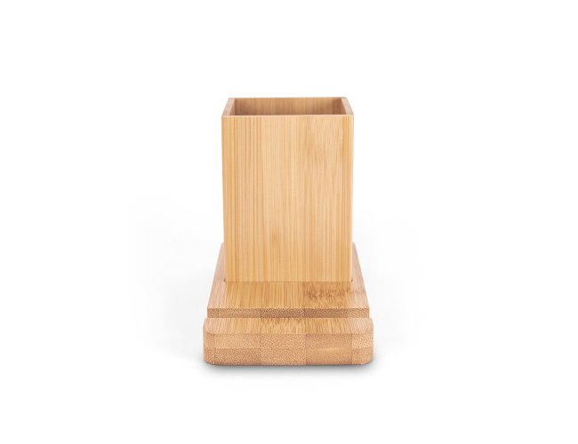 Conjunto de mesa em bambu, ideal para organizar o seu espaço de trabalho. Composto por 1 canaleta para suporte do seu celular e um copo, desmontável, para organizar as suas esferográficas e outros materiais de trabalho. Fornecido em caixa presente de papel kraft reciclado. A cor e o resultado da impressão nos materiais naturais pode variar entre produtos. Dimensões montado: 80 x 145 x 104 mm - Caixa: 80 x 145 x 33 mm