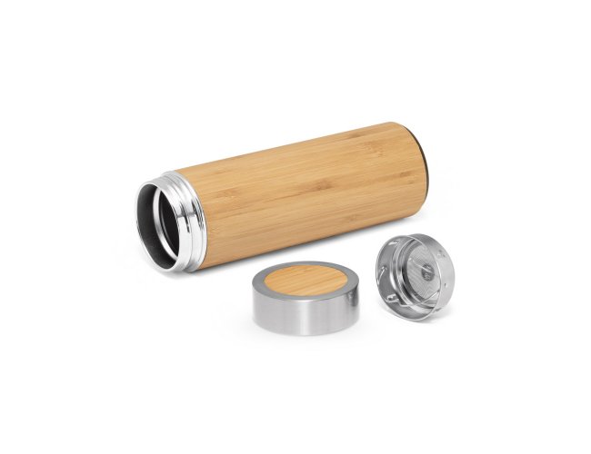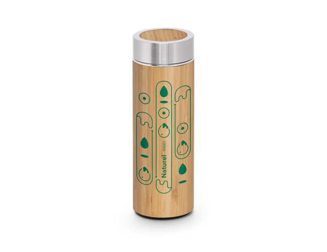 Garrafa em aço inox 90% reciclado e bambu de parede dupla térmica, isolada a vácuo. Possui tampa em aço inox com detalhe em bambu e infusor de chá no interior da garrafa. Capacidade até 430 mL. Preserva as bebidas quentes por 8 horas e as bebidas frias por 12 horas. Fornecido em caixa presente. Certificação EU Food Grade. A cor e o resultado da impressão nos materiais naturais pode variar entre produtos. ø69 x 207 mm - Caixa: 72 x 210 x 72 mm