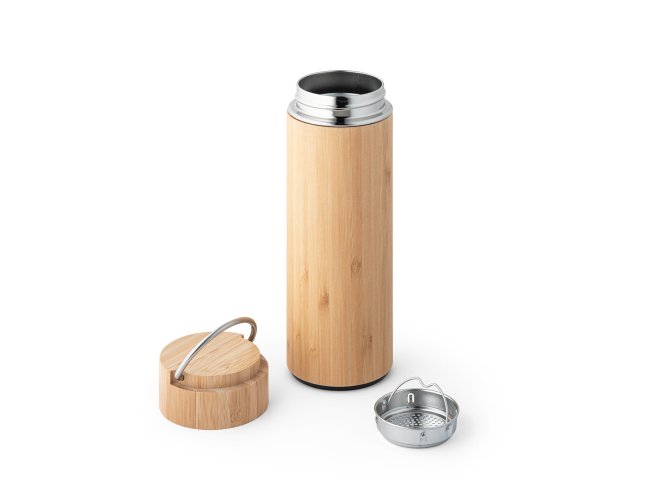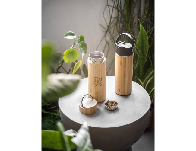 Garrafa em aço inox e bambu de parede dupla térmica, isolada a vácuo. Possui tampa com alça para fácil transporte e infusor em aço inox para chá. Capacidade até 440 mL. Preserva as bebidas quentes por 8h e as bebidas frias por 24h. Fornecida em caixa presente de papel kraft reciclado. Certificação EU Food Grade. A cor e o resultado da impressão nos materiais naturais pode variar entre produtos. ø70 x 215 mm